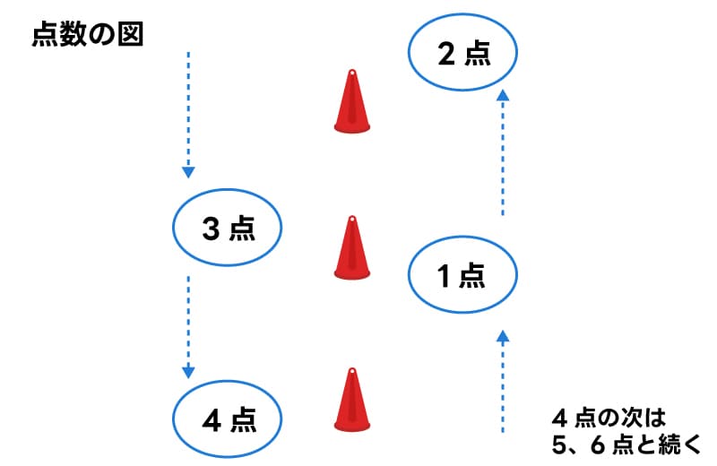 - 守備側は、打ったボールと投げたボールの2個を捕り、2個ともアテチャンに当てる。その時点で走ったコーンまでの点数が攻撃側に入る。