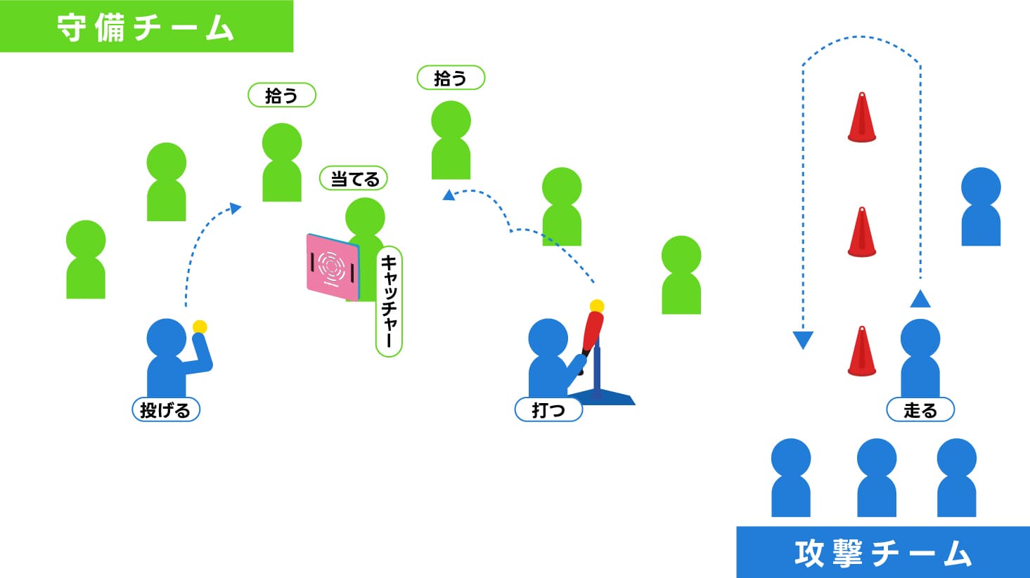 - 攻撃側は、打つ人、走る人、投げる人が全て異なる。