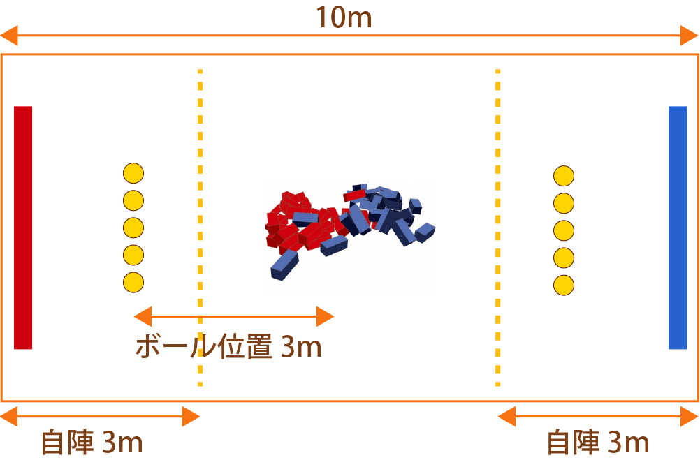 ・ブロックからそれぞれ3m離れた場所にボールを5個ずつ置く